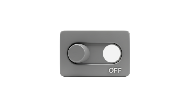 Gray toggle switch in the off position with the word off displayed isolated on transparent background