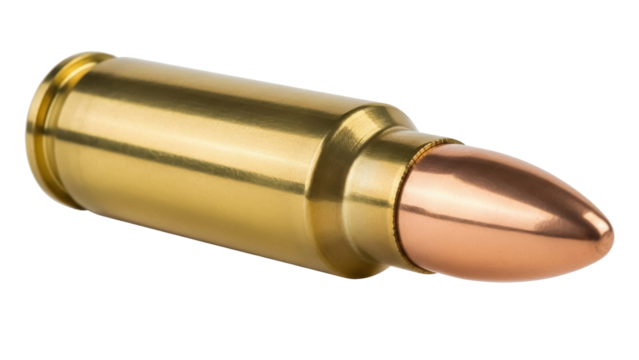 Shiny golden bullet isolated PNG, ammunition for firearms on transparent background, cartridge for shooting and hunting, metallic projectile