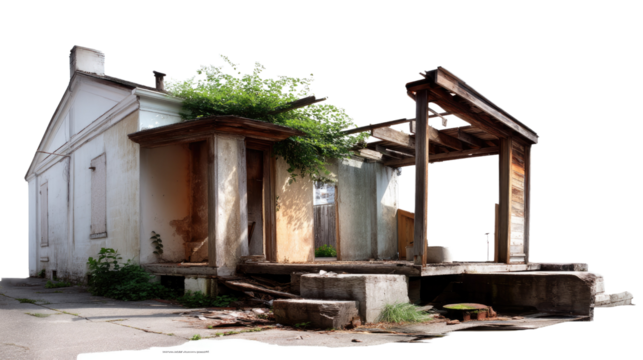 Decaying Structure Amidst Debris: A weathered architectural ruin stands defiant against the ravages of time, revealing a scene of quiet devastation.