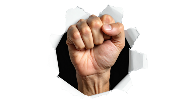 A clenched fist punches through a torn, white-edged hole against a black backdrop