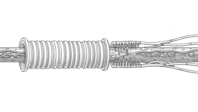 Monochrome crosssectional drawing highlighting the structural differences between normal myelin and areas of sheath loss along an axon emphasizing contrast in a scientific style.