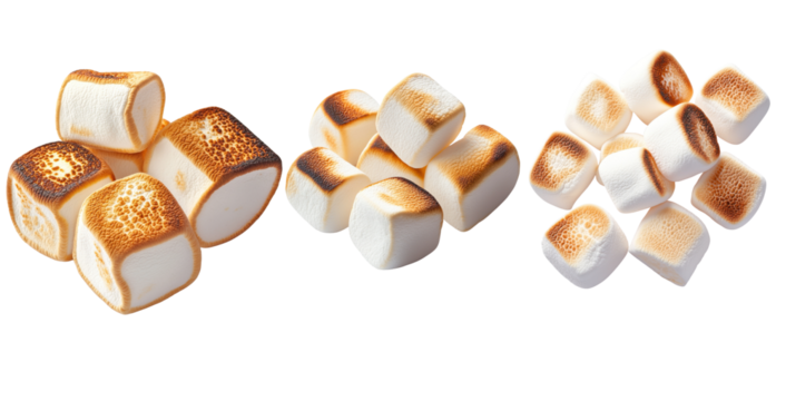 An arrangement of toasted marshmallows, showcasing varying degrees of caramelization and texture.