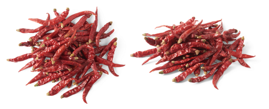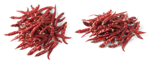 pile of dried red chili or cayenne peppers in different angles, set of hot spice isolated