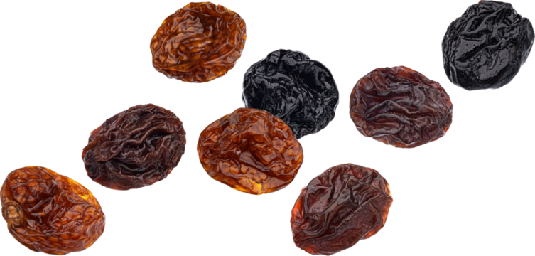 A pile of dried prunes with a transparent background.