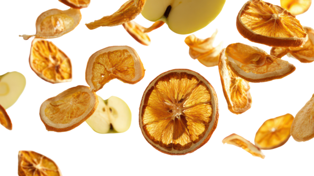 Freeze dried apple pieces floating on transparent background