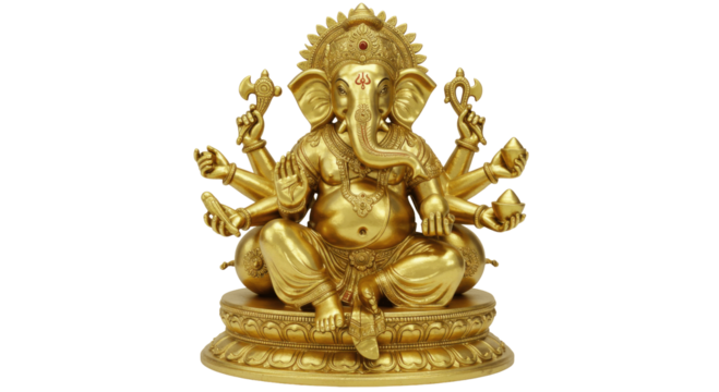 Golden Multi-Armed hindu god Ganesha Statue Isolated on Transparent PNG Background