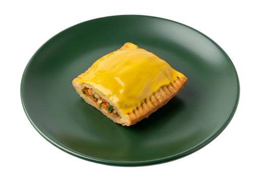 A delectable pastry, topped with vibrant yellow glaze, rests on a deep green plate against a black backdrop.