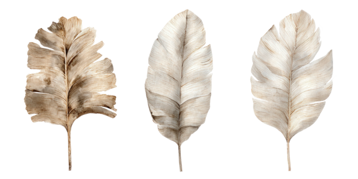 Three watercolor-style leaves against a transparent backdrop, featuring delicate detail and neutral tones