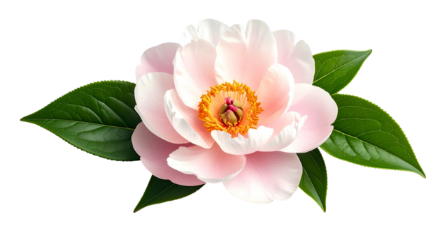 A close-up of a delicate pink peony flower with green leaves, isolated on black