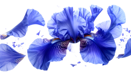 Dynamic blue iris blossom with gracefully scattering petals, an ethereal and vibrant floral composition capturing nature's delicate beauty and luminous artistry