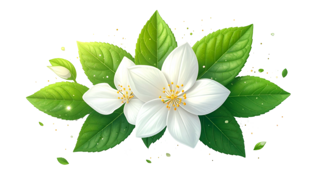 Close-up of delicate white flowers with vibrant green leaves, details and highlights visible