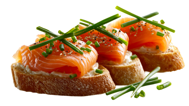 Slices of toasted baguette topped with creamy white cheese, delicately folded smoked salmon, and fresh green chives, perfectly seasoned for an elegant appetizer or snack recipe presentation.