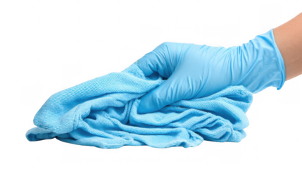 Gloved hand delicately folds a soft, white towel, emphasizing hygiene and cleanliness against a transparent background, perfect for showcasing product placement or health related concepts