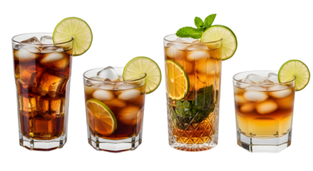 Assorted Iced Tea and Cola Drinks with Lime Slices PNG Cut Out.
