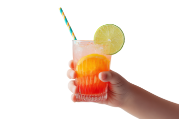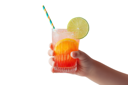 Child's hand holding a colorful fruit punch mocktail with straw, transparent background