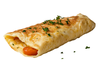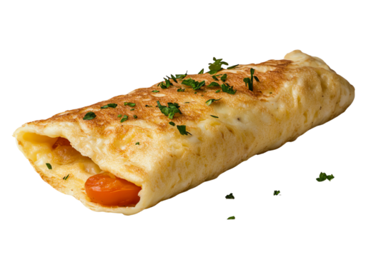 Delicious omelette roll filled with cheese and vegetables, garnished with fresh herbs, isolated on a white background.