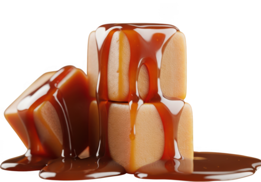 Deliciously drizzled caramel cubes stacked together isolated on transparent background