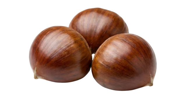 Chestnut Trio: A close-up shot showcasing three glistening chestnuts, their smooth, rich brown surfaces hinting at the deliciousness within, perfect for culinary and seasonal themes.