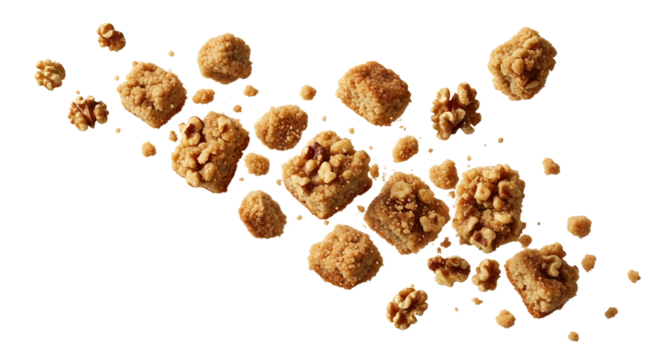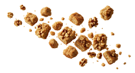 Elevated walnut squares dance against a stark backdrop, a delightful confectionary ballet, capturing an ethereal moment of culinary levitation