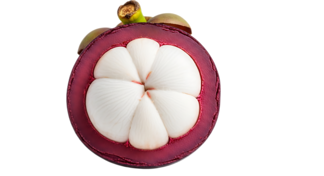 Close up of a sliced mangosteen fruit showing the white segments and purple rind on black background