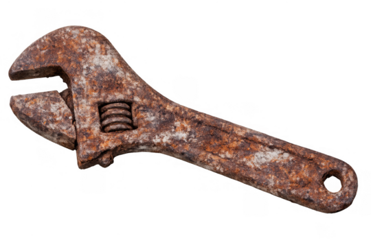 Rusty adjustable wrench, a vintage metal tool displaying heavy corrosion and oxidation. Isolated on a transparent background