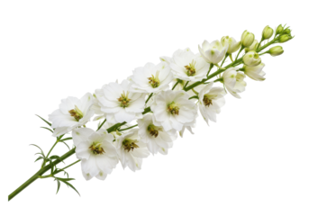 Delphinium flower with white petals isolated on transparent background, close up shot