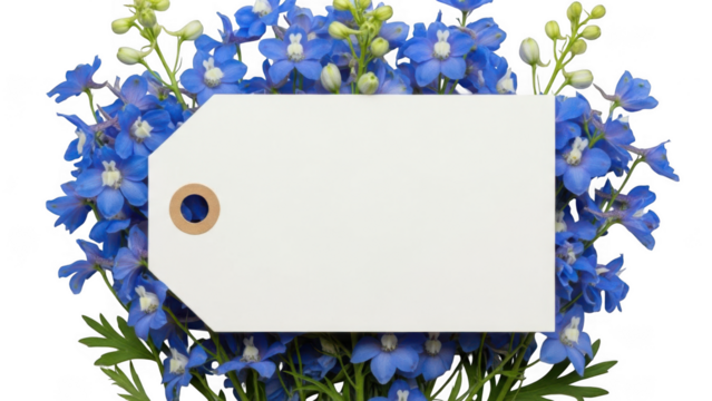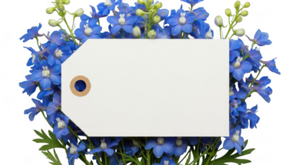Blue delphinium flowers with a white blank tag for text isolated on transparent background