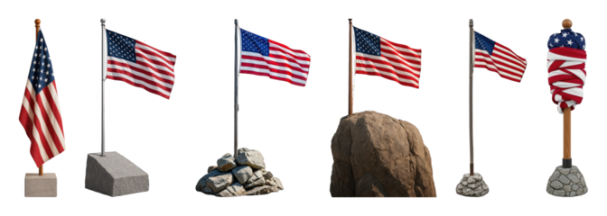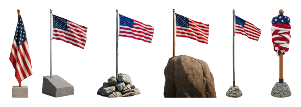 American flag set including flying, furled, and draped variations with diverse poles and bases isolated. Patriotism and national celebrations.
