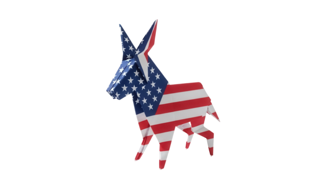 Origami donkey with American flag pattern isolated PNG, patriotic symbol for USA elections and political campaigns on transparent background