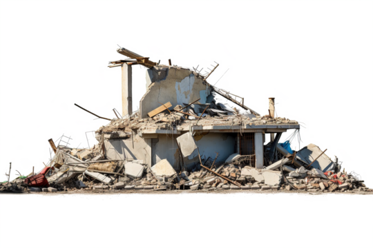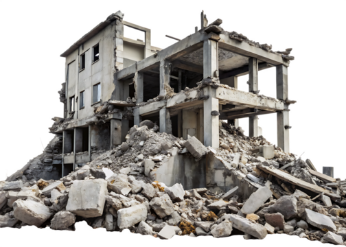 Collapsed concrete building with piles of rubble and debris isolated on a transparent background ruined building