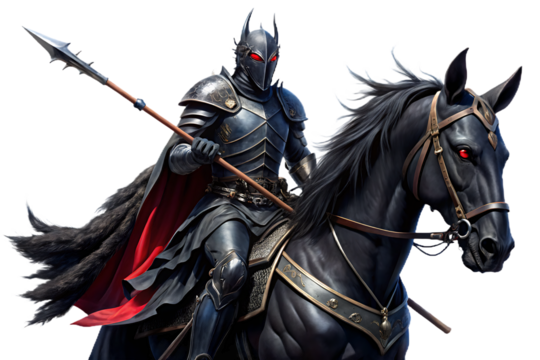 Knight in dark armor on black horse with red eyes isolated on a white background