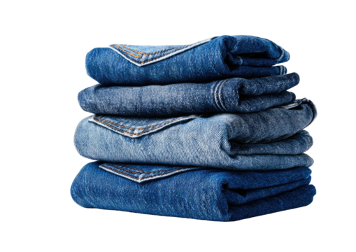 Stack of folded blue denim jeans isolated on transparent background, showcasing casual fashion and trendy apparel for retail display