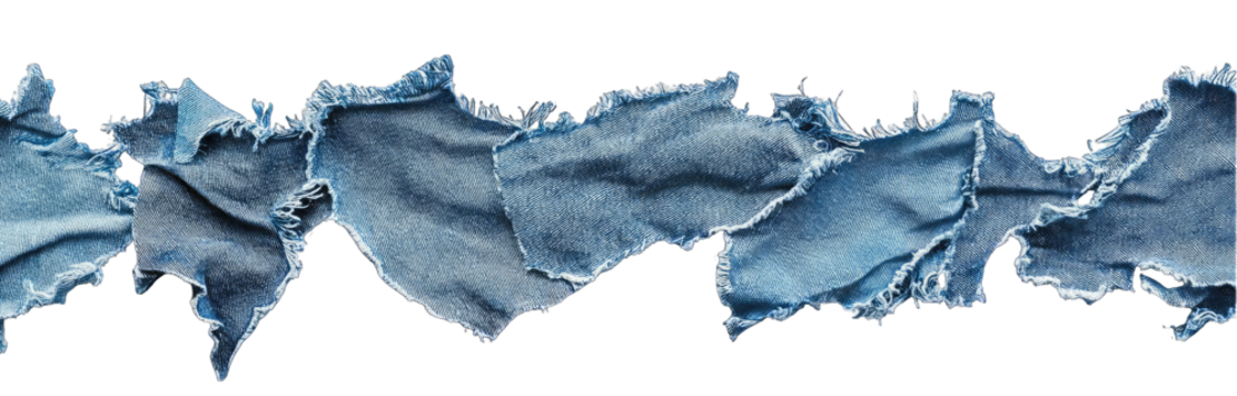 blue jeans denim texture, clothing textile fabric material, realistic scrap with torn edges, sign, label, banner, element, isolated on a transparent background, grunge textured graphic element