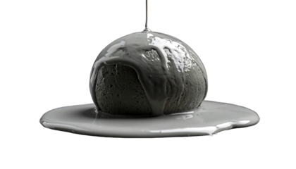 A spherical form being coated with a viscous, light grey substance