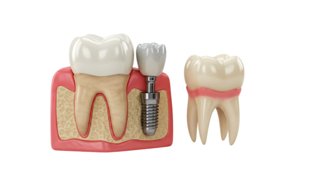 Modern dental implant model showcasing restorative dentistry options, a clean aesthetic for advertisements related to oral health and cosmetic procedures isolated on white or transparent png.