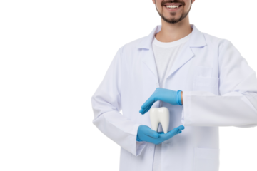 Healthcare professional holding dental tools and a mask, white isolate background.