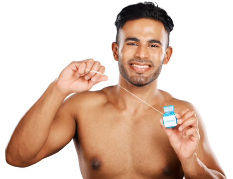 Floss, smile and portrait of man for healthy dental care, gingivitis or plaque isolated on transparent png background. Happy indian guy, container or oral thread for cleaning, fresh breath or hygiene