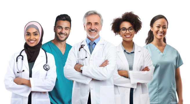 A happy female pharmacist standing with your arms crossed with confidence, transparent, isolated on white.