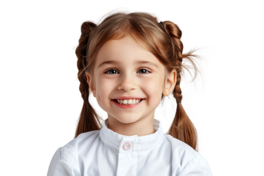 Studio portrait of cute little girl wearing doctor or dentist outfit costume with smile and looking at camera isolated on transparent png background.