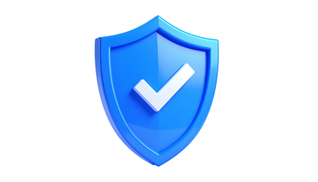 A 3D rendered blue shield with a white checkmark, symbolizing security and validation, floating on a black background