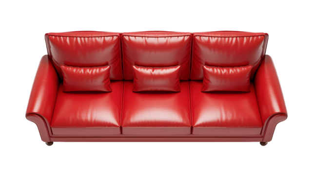 A comfortable three seater sofa upholstered in vibrant red glossy material featuring plump back cushions and three decorative throw pillows for modern interior style rendered under soft stud