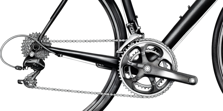 A Detailed Black and White Engraving of a Road Bicycle Drivetrain Showing the Crankset Chain and Derailleur System on a Transparent Background.