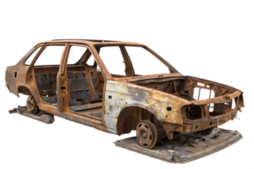 rusty abandoned car frame in a scrap yard isolated on white background PNG