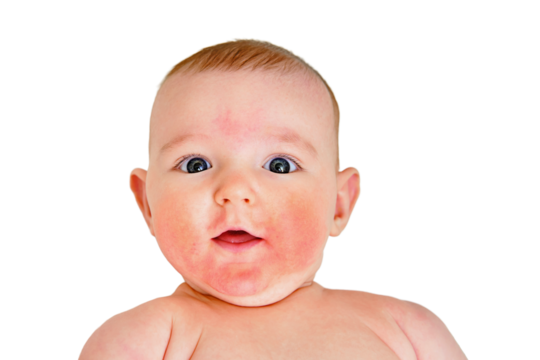 Portrait of a happy infant baby with allergies, red skin dermatitis, isolated on a white background. Kid aged four months