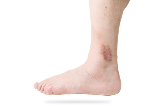 Atopic dermatitis (AD), also known as atopic eczema on leg isolated on white background.