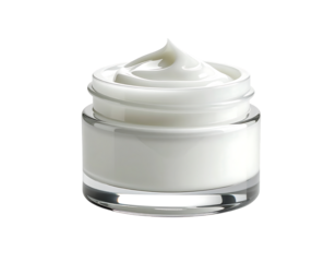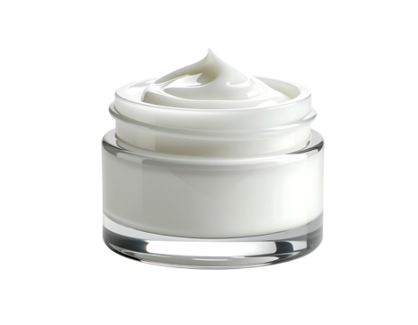 Creamy white moisturizer in a clear glass jar, swirled texture visible, isolated on black