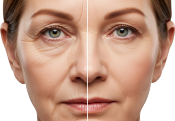 Split image showing aging skin with wrinkles and smoother skin isolate face beauty woman dermatology