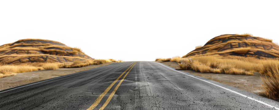 Straight road through desert landscape with dunes isolated on transparent background