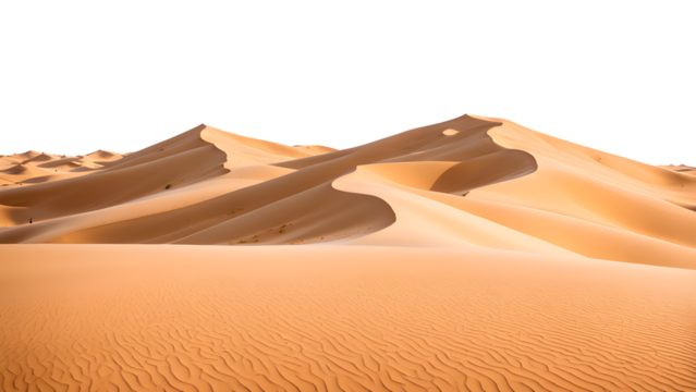 Dune of hot desert sand landscape isolated in a transparent background. Cut out or PNG. Sandy dunes stretch across the golden desert under a clear sky