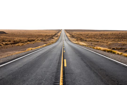 Empty desert highway with yellow center line disappearing into distance through sparse vegetation and rolling hills, isolated on a transparent background